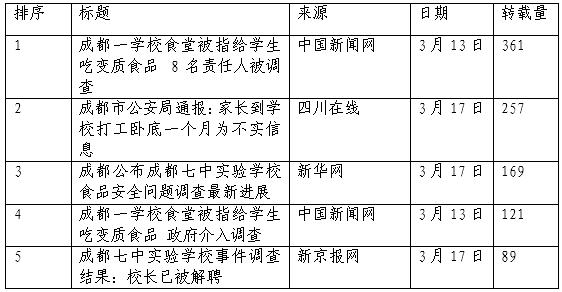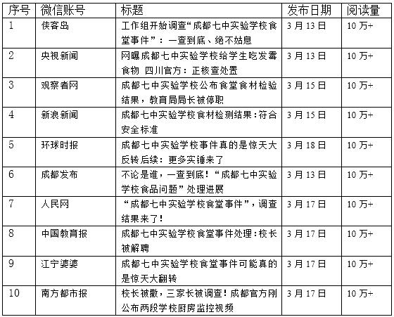 第一,關注事件進展。如人民網(wǎng)發(fā)表《成都一學校食堂被指給學生吃變質(zhì)食品政府介入調(diào)查》、海外網(wǎng)發(fā)表《溫江區(qū)委:成都小學食材發(fā)霉檢測結果3月15日公布》、四川在線發(fā)表《成都市委回應“小學食堂食物過期”事件:一查到底、嚴懲不貸》、中國經(jīng)濟網(wǎng)發(fā)表《成都七中實驗學校微信公眾號發(fā)布了成都冠城集團公開致歉信》、中國經(jīng)濟網(wǎng)發(fā)表《成都學校食堂問題后續(xù):溫江區(qū)教育局局長、市場監(jiān)管局副局長停職檢查》、澎湃新聞發(fā)表《警方通報:散布涉成都七中實驗學校網(wǎng)絡不實信息,一人被刑拘》、人民網(wǎng)發(fā)表《市場監(jiān)管總局:國務院高度重視成都七中實驗學校食品安全問題》等。
