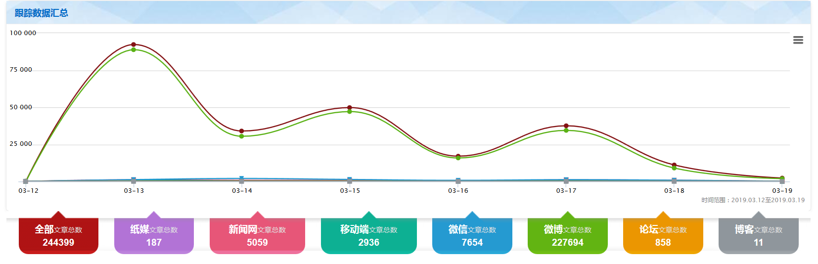 從輿情走勢來看,以3月12日~3月21日為監(jiān)測時間段,如圖1所示,輿情整體呈現(xiàn)“波浪式”特征,網(wǎng)民關注度遠高于媒體關注度,并帶動整體輿情走勢。