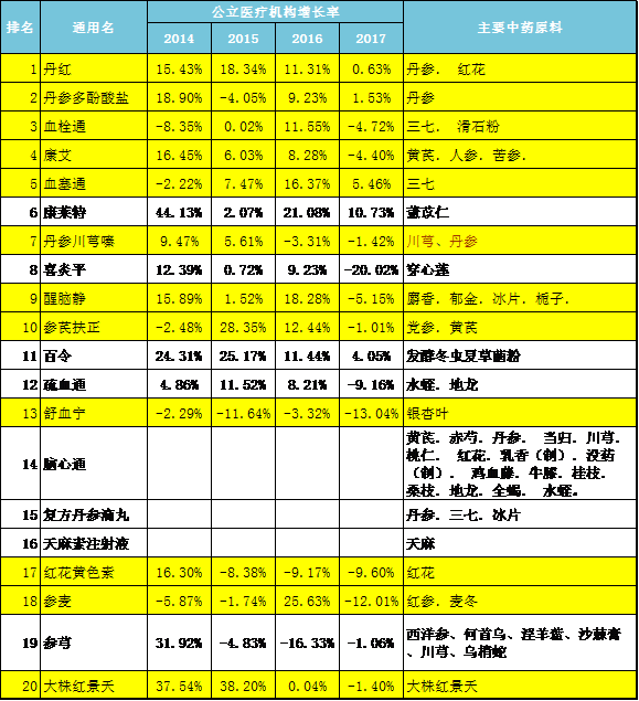 如表3,在國內公立醫(yī)療機構銷量前20位品種中,描黃色的是已被納入輔助用藥并重點監(jiān)控的品種,基本都是在醫(yī)療機構銷售占比過高的中藥注射劑。被重點監(jiān)控后,其臨床銷售量預計會出現較大幅度下滑,從而影響到丹參、紅花、三七、人參等熱點中藥材的需求量。