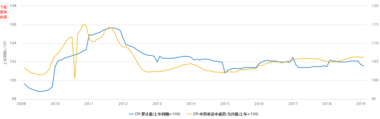 圖4 2009年-2018年國內中藥材及中成藥CPI指數運行(國家統(tǒng)計局發(fā)布)