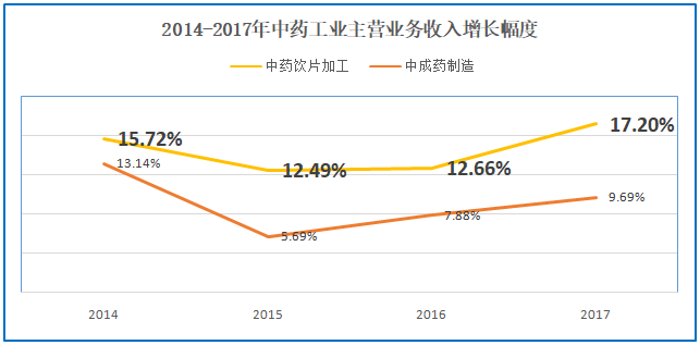 醫(yī)藥工業(yè)連續(xù)4年領跑22個工業(yè)門類,但與表現優(yōu)異的中藥飲片板塊相比,中成藥制造業(yè)持續(xù)低迷,2014-2017年主營業(yè)務收入平均增速只有9.1%;而同時期,中藥飲片工業(yè)的增速高達14.52%。預計2018年,國內中藥飲片工業(yè)營收水平增速將超過18%,占整個中藥工業(yè)的比重也將從2017年的28.3%上升到30%左右,并帶動飲片渠道原料需求快速增長。