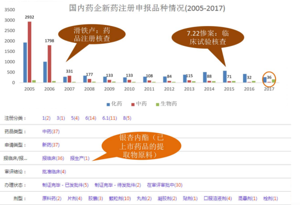 圖15 2005-2017年,國內新藥注冊申報情況統(tǒng)計(根據原國家食藥監(jiān)總局發(fā)布數據整理)