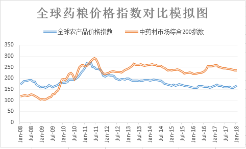 我們通過多項指數模擬,發(fā)現反映國內中藥材市場行情運行的中藥材天地網綜合200指數(以下簡稱綜合200指數)運行,與全球糧價緊密關聯(lián)。通過等比例縮放,二者保持錯峰相關性,即藥材價格下行,多在糧價下行半年后發(fā)生。原因是在藥糧比作用下,糧價過低會刺激各地加強藥材種植積極性,從而導致藥材跌價;反之亦然。