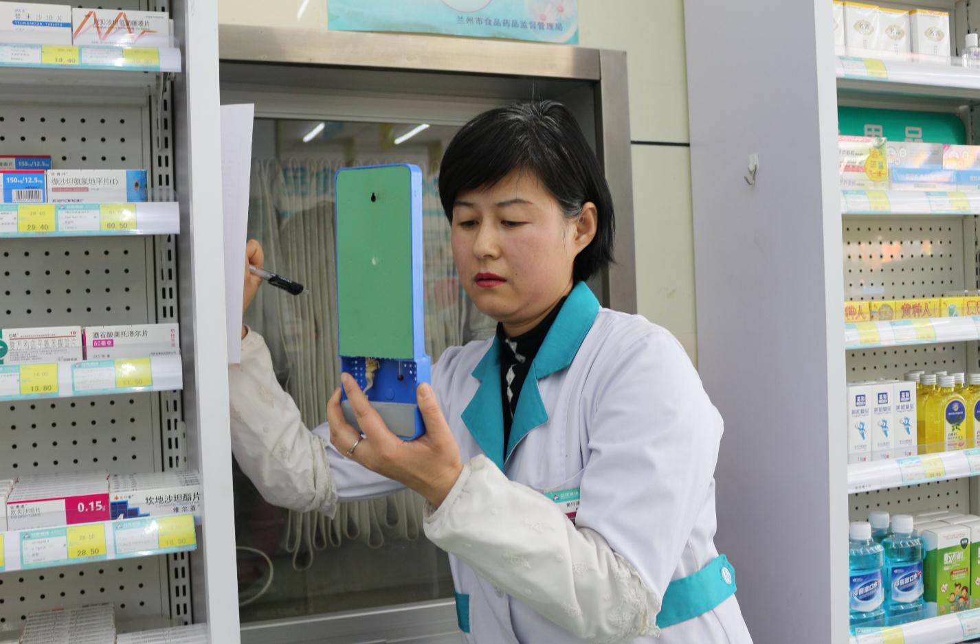 黃月萍在填寫藥店溫濕度記錄表。記者 丁怡媛 攝