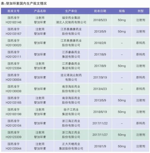 目前,多家國內(nèi)藥企同時擁有替加環(huán)素的原料藥和制劑生產(chǎn)文號(見表),具備了從原料藥到制劑的完整產(chǎn)業(yè)鏈。在當前集采控費的背景下,同時擁有原料藥和制劑生產(chǎn)批文的廠家在控制整體成本上具有更大的空間,在市場持續(xù)競爭上更有優(yōu)勢。后續(xù)這樣的企業(yè)還有可能增加。