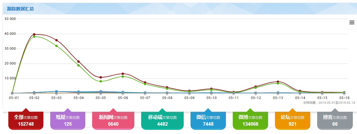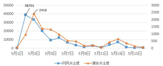 從輿情走勢來看,以5月2日~5月16日為監(jiān)測時間段,如圖1所示,輿情整體呈現(xiàn)“波浪式”特征,網(wǎng)民關(guān)注度遠(yuǎn)高于媒體關(guān)注度。