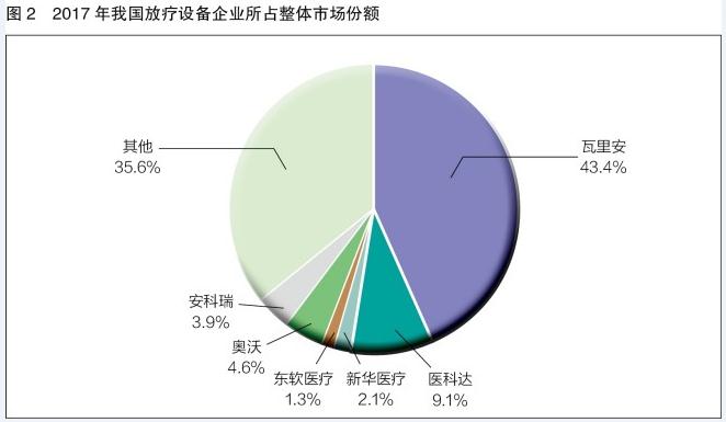 瓦里安醫(yī)療設(shè)備(中國)有限公司是我國醫(yī)用直線加速器以及質(zhì)子重離子設(shè)備領(lǐng)域的重點(diǎn)企業(yè),在我國放療設(shè)備整體市場中占有較高的比重。2017年,我國放療設(shè)備行業(yè)中瓦里安的市場份額為43.4%,醫(yī)科達(dá)為9.1%,奧沃為4.6%,安科瑞為3.9%,新華醫(yī)療為2.1%,東軟醫(yī)療為1.3%,其他為35.6%(見圖2)。