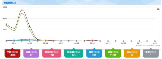以5月31日~6月19日為監(jiān)測時間段,輿情出現(xiàn)兩個峰值,網(wǎng)民關注度遠高于媒體關注度。