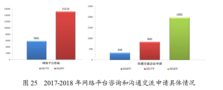為進(jìn)一步為申請(qǐng)人提供便利,藥審中心不斷豐富溝通交流渠道,提高溝通交流效率和質(zhì)量,形成了溝通交流會(huì)議、網(wǎng)絡(luò)平臺(tái)咨詢(一般性技術(shù)問題)、電話咨詢、郵件咨詢和現(xiàn)場(chǎng)咨詢的多渠道、多層次的溝通交流模式。2018年藥審中心接收溝通交流申請(qǐng)1982件,較2017年的840件增長(zhǎng)了136%;接收網(wǎng)絡(luò)平臺(tái)咨詢15219個(gè),較2017年的5881個(gè)增長(zhǎng)了159%,電話咨詢超過上萬次,郵件咨詢數(shù)千次,同時(shí)每周三定期開展現(xiàn)場(chǎng)咨詢。2017至2018年網(wǎng)絡(luò)平臺(tái)咨詢和溝通交流申請(qǐng)具體情況見圖25。