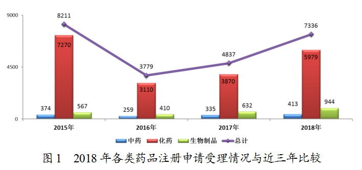 2018年,藥審中心受理的7336件新注冊(cè)申請(qǐng)中,化藥注冊(cè)申請(qǐng)受理量為5979件,占2018年全部注冊(cè)申請(qǐng)受理量的82%,2018年各類藥品注冊(cè)申請(qǐng)受理情況與近三年比較詳見圖1。