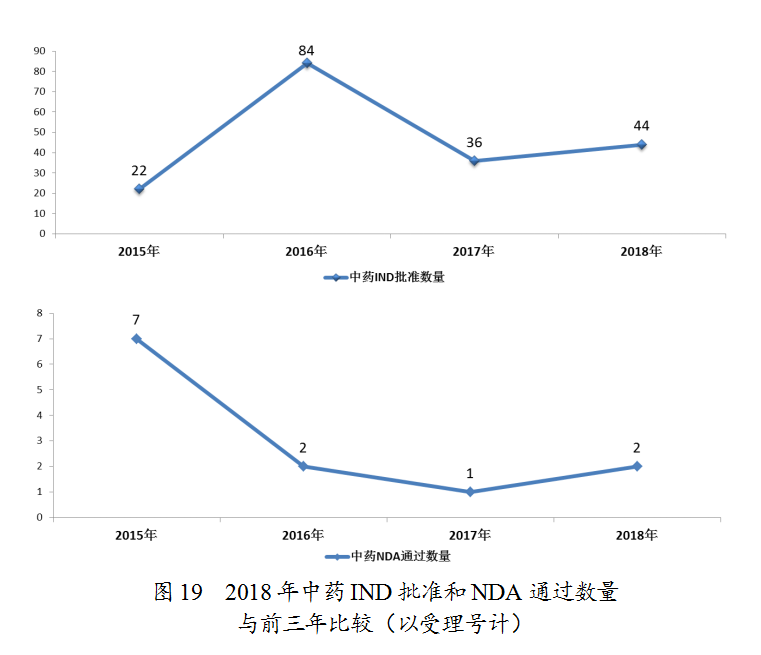 藥審中心審評(píng)通過批準(zhǔn)中藥IND申請(qǐng)44件;審評(píng)通過中藥NDA 2件(涉及2個(gè)品種,關(guān)黃母顆粒、金蓉顆粒)。完成審評(píng)的中藥各類注冊(cè)申請(qǐng)具體情況詳見表2,中藥IND批準(zhǔn)和NDA通過量與前三年比較(以受理號(hào)計(jì))詳見圖19。