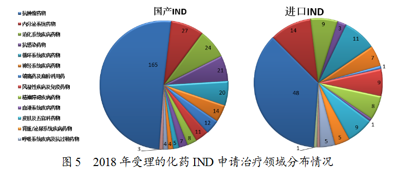 藥審中心受理化藥IND申請(qǐng)457件,其中受理國(guó)產(chǎn)化藥IND申請(qǐng)325件,受理進(jìn)口IND申請(qǐng)132件。國(guó)產(chǎn)化藥IND申請(qǐng)的適應(yīng)癥主要集中在抗腫瘤、內(nèi)分泌系統(tǒng)和消化系統(tǒng)領(lǐng)域。進(jìn)口IND申請(qǐng)的適應(yīng)癥主要集中在抗腫瘤、內(nèi)分泌系統(tǒng)和循環(huán)系統(tǒng)領(lǐng)域,具體治療領(lǐng)域分布詳見圖5。