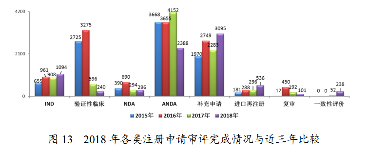 藥審中心完成IND申請(qǐng)審評(píng)1094件,完成NDA審評(píng)296件,完成ANDA審評(píng)2388件,2018年各類注冊(cè)申請(qǐng)審評(píng)完成情況與近三年比較詳見圖13。