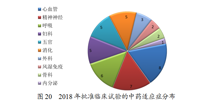 藥審中心審評(píng)通過批準(zhǔn)臨床試驗(yàn)的中藥IND申請(qǐng)44件,涉及10個(gè)適應(yīng)癥領(lǐng)域,其中心血管、精神神經(jīng)、呼吸較多,共占48%,具體治療領(lǐng)域分布詳見圖20。