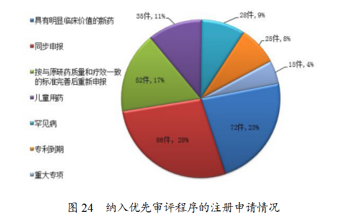根據(jù)國(guó)家食品藥品監(jiān)督管理總局(以下簡(jiǎn)稱原總局)《關(guān)于鼓勵(lì)藥品創(chuàng)新實(shí)行優(yōu)先審評(píng)審批的意見》(食藥監(jiān)藥化管〔2017〕126號(hào)),2018年,藥審中心共將313件注冊(cè)申請(qǐng)納入優(yōu)先審評(píng)程序,其中兒童用藥和罕見病用藥63件。2018年納入優(yōu)先審評(píng)的注冊(cè)申請(qǐng)中,同步申報(bào)的品種占比最大,占比為28%,其次為具有明顯臨床價(jià)值的新藥,占比為23%。納入優(yōu)先審評(píng)程序的注冊(cè)申請(qǐng)情況詳見圖24。
