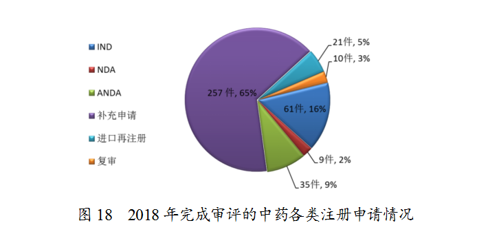 藥審中心完成審評(píng)的中藥注冊(cè)申請(qǐng)393件,其中完成IND申請(qǐng)61件,完成NDA 9件,完成ANDA 35件。完成審評(píng)的中藥各類注冊(cè)申請(qǐng)情況詳見圖18。