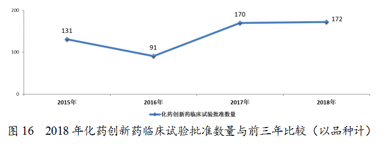 藥審中心完成審評(píng)的化藥IND申請(qǐng)603件,審評(píng)通過批準(zhǔn)IND申請(qǐng)554件,其中批準(zhǔn)1類創(chuàng)新藥臨床試驗(yàn)申請(qǐng)449件(涉及172個(gè)品種)。1類化藥創(chuàng)新藥臨床試驗(yàn)批準(zhǔn)數(shù)量與前三年比較(以品種計(jì))詳見圖16。