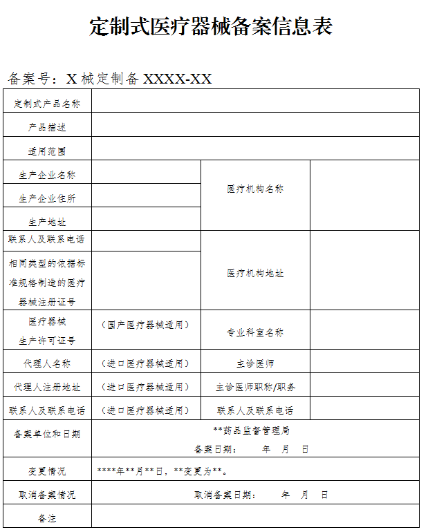 已備案的定制式醫(yī)療器械,備案信息表(見附2)登載內(nèi)容發(fā)生變化的,備案人應(yīng)當(dāng)提交變化情況的說明及相關(guān)證明文件,向原備案部門變更備案信息。備案資料符合形式要求的,省、自治區(qū)、直轄市藥品監(jiān)督管理部門應(yīng)當(dāng)在變更情況欄中載明變化情況。
