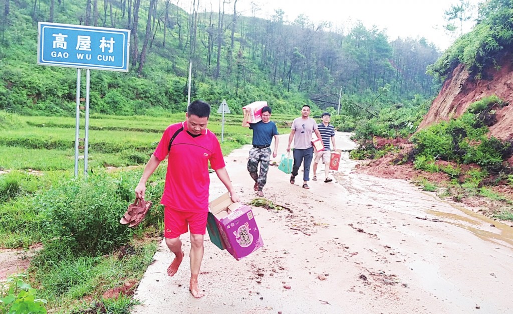 圖為7月14日該局救災(zāi)應(yīng)急分隊(duì)在沙心鄉(xiāng)高屋村搬運(yùn)救災(zāi)物資。王雨林、王彥君 攝影報(bào)道