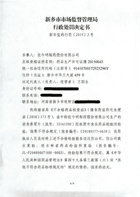 今年5月,新鄉(xiāng)市市場監(jiān)督管理局向佐今明制藥股份有限公司下達編號為新市監(jiān)藥行罰【2019】2號行政處罰決定書,認定貴司生產(chǎn)、銷售批號為32161202消食養(yǎng)胃片為劣藥,依法查處涉案產(chǎn)品5961盒,并在該局的監(jiān)督下銷毀該批次召回藥品。
