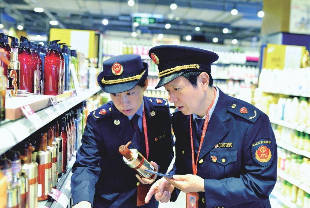 圖為執(zhí)法人員在一家大型超市檢查化妝品網(wǎng)上備案情況。黃躍輝 攝