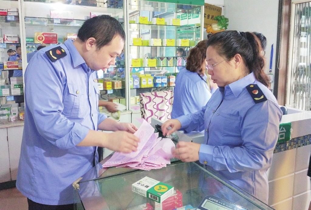 圖為執(zhí)法人員在一家藥店檢查藥品采購(gòu)票據(jù)。彭禹銘 攝
