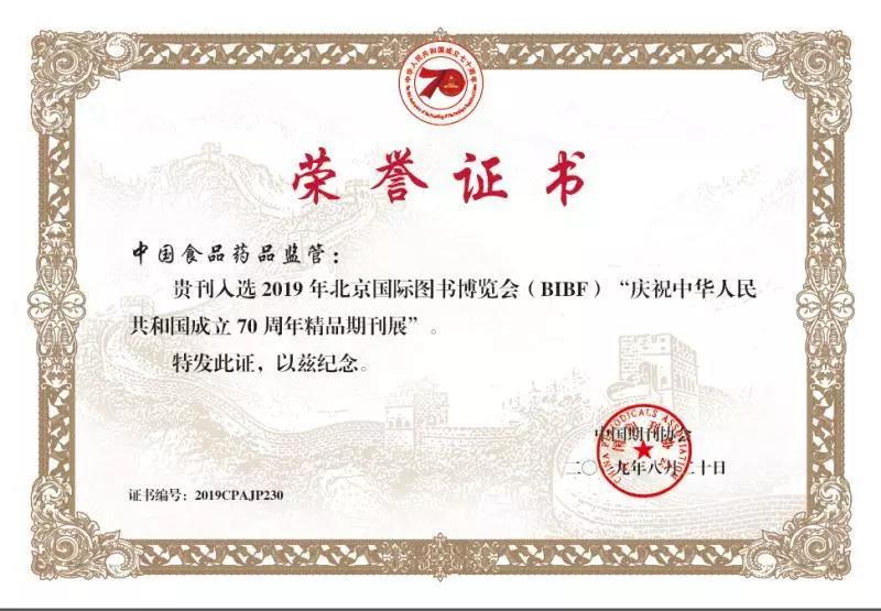 經(jīng)資格審核和專家遴選,《中國(guó)食品藥品監(jiān)管》作為“新中國(guó)獲獎(jiǎng)期刊”入選“慶祝中華人民共和國(guó)成立70周年精品期刊展”。