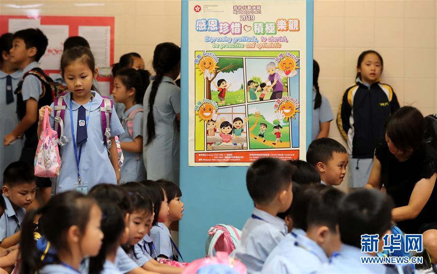 9月2日,在香港油麻地天主教小學,小朋友在參加開學日活動。新華社記者 李鋼 攝