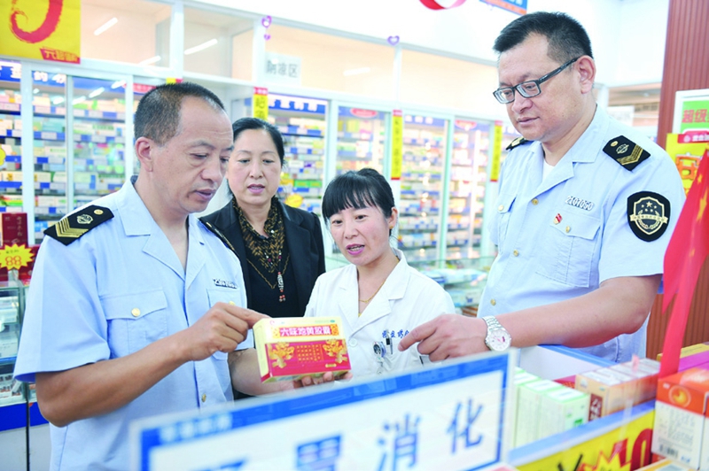 圖為該局執(zhí)法人員在錦州遼沈戰(zhàn)役紀(jì)念館景區(qū)附近一家藥店檢查。(胡國(guó)鋒 孫淵 攝影報(bào)道)