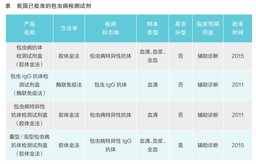 對來源于患者或疑似患者人體樣本中的包蟲病感染相關(guān)生物標志物進行檢測是輔助診斷該病的重要手段。相關(guān)生物標志物包括特異性抗體、循環(huán)抗原、免疫復(fù)合物、病原體核酸等。我國已批準四個包蟲病抗體檢測試劑(見表)。已批準產(chǎn)品均采用免疫學方法對樣本中的病原體抗體進行檢測,但免疫學檢測有其自身的局限性:一方面,由于細粒棘球蚴和多房棘球蚴兩種病原體自身抗原存在交叉,導致應(yīng)用抗體檢測來區(qū)分囊型/泡型的效果欠佳;另一方面,抗體檢測無法區(qū)分現(xiàn)癥感染與既往感染。