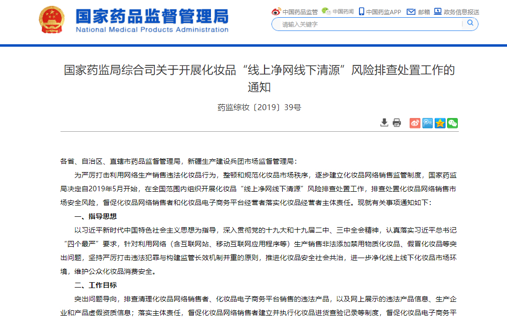 2019年4月30日,國家藥監(jiān)局官網(wǎng)發(fā)布通知,在全國范圍內(nèi)部署開展“線上凈網(wǎng)線下清源”風險排查處置工作,排查處置化妝品網(wǎng)絡(luò)銷售市場安全風險,整頓和規(guī)范化妝品市場秩序,逐步建立化妝品網(wǎng)絡(luò)銷售監(jiān)管制度。