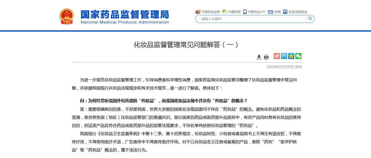2019年1月10日,國家藥監(jiān)局官網(wǎng)發(fā)布化妝品監(jiān)督管理常見問題解答(以下簡稱“問題解答”),回應(yīng)業(yè)界關(guān)注的能否使用藥妝品概念、表皮生長因子(EGF)能否作為化妝品原料使用等問題。