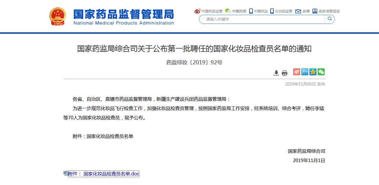 2019年11月6日,國家藥監(jiān)局官網(wǎng)發(fā)布通知,公布第一批聘任的國家化妝品檢查員名單。經(jīng)過系統(tǒng)培訓、綜合考評,來自國家、部分省市級和地市級藥品監(jiān)管部門,以及部分省級、地市級食品藥品檢驗檢測機構(gòu),省級藥品審評機構(gòu)、技術(shù)審評核查機構(gòu)、藥品評價機構(gòu)中心和大專院校共計70名人員被聘任為國家化妝品檢查員。主要承擔特殊用途化妝品研發(fā)過程現(xiàn)場檢查;承擔化妝品境外現(xiàn)場檢查以及生產(chǎn)環(huán)節(jié)重大有因檢查。