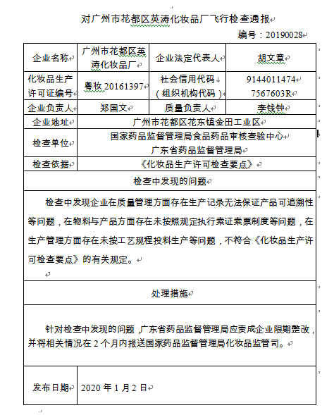 飛檢通報(bào):對(duì)廣州市花都區(qū)英濤化妝品廠飛行檢查通報(bào)