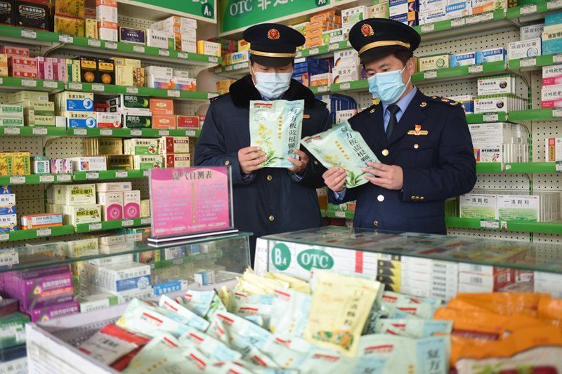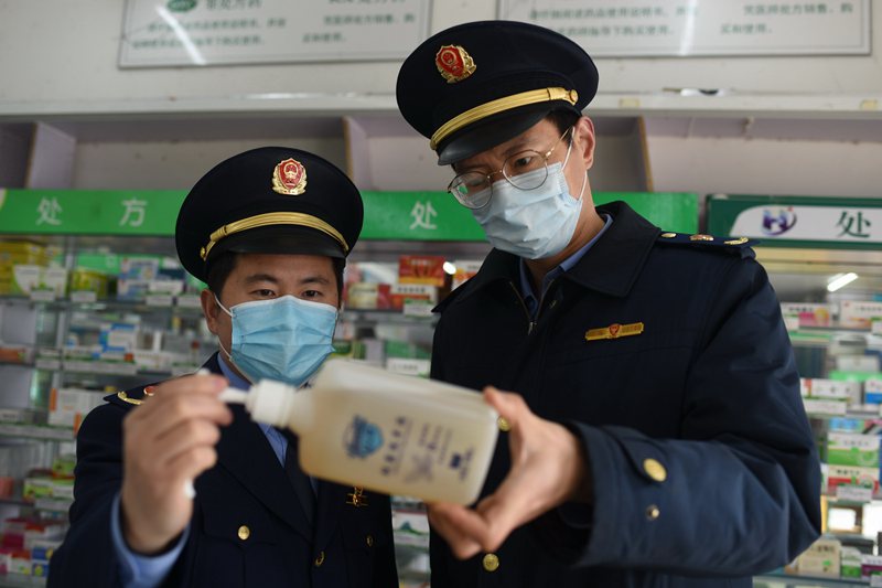 2020年2月7日,江蘇省連云港市東??h市場(chǎng)監(jiān)管局執(zhí)法人員正在青湖鎮(zhèn)一家藥店進(jìn)行質(zhì)量巡查。(張玲 董自李 攝)