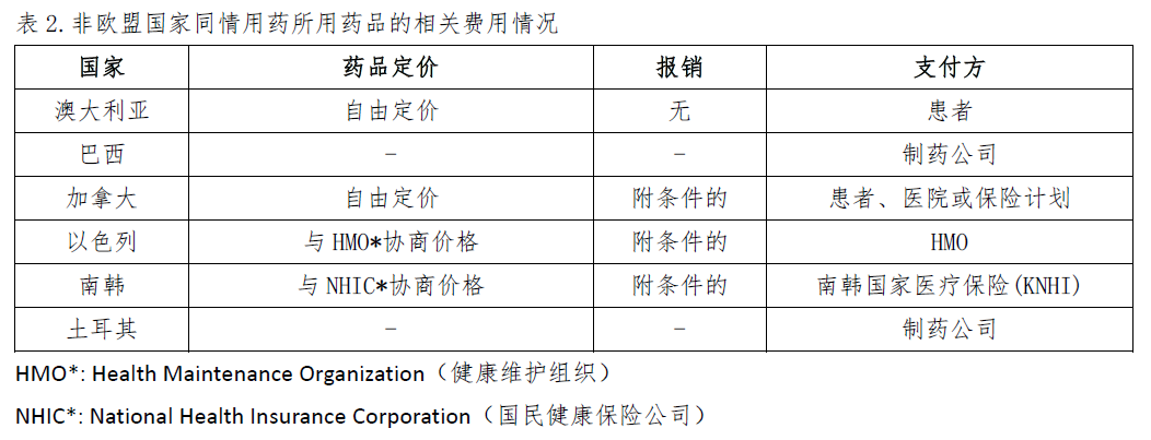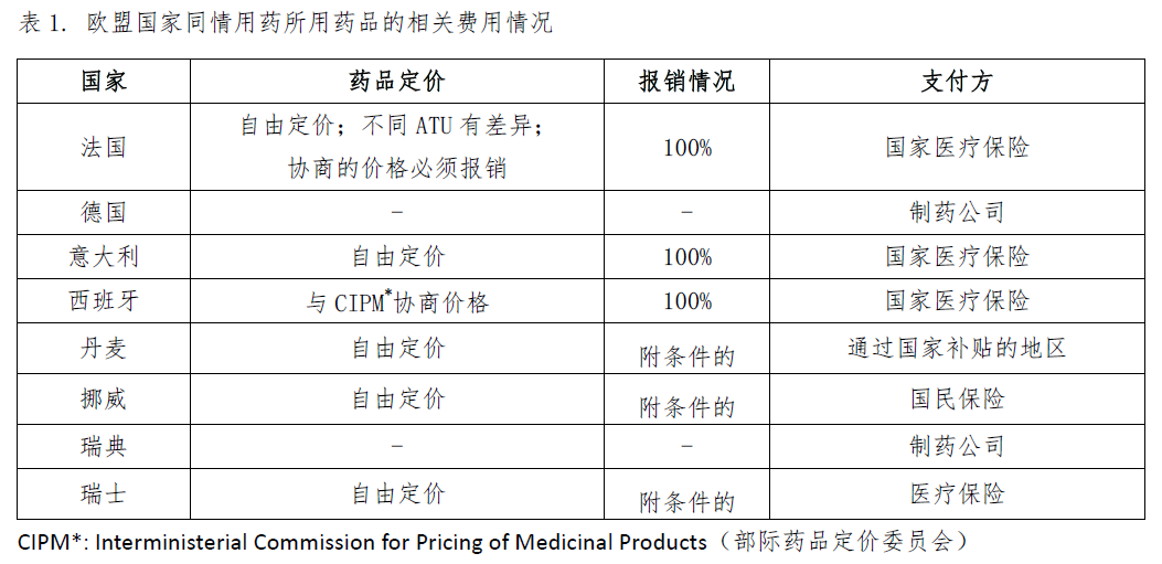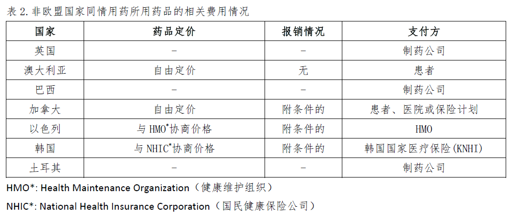 不同的國家和地區(qū)關(guān)于同情用藥的藥品定價(jià)、報(bào)銷比例以及費(fèi)用支付方的規(guī)定不盡相同,詳見表1和表2。