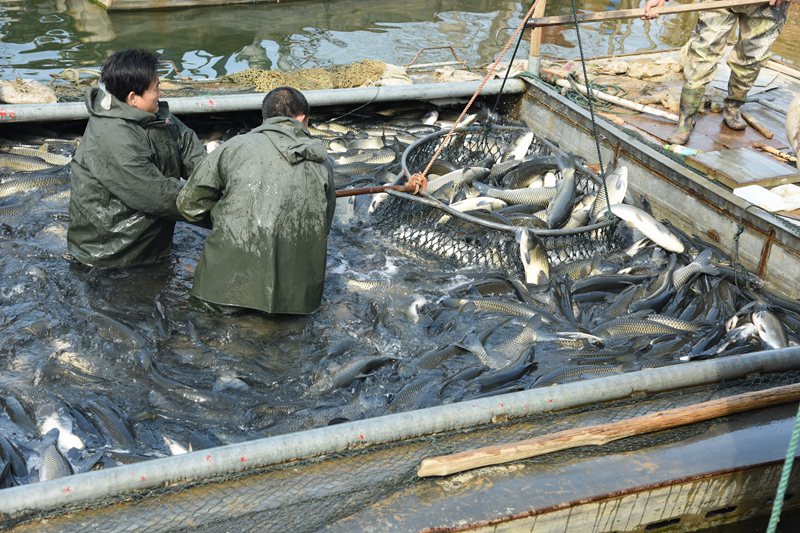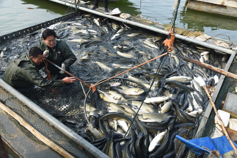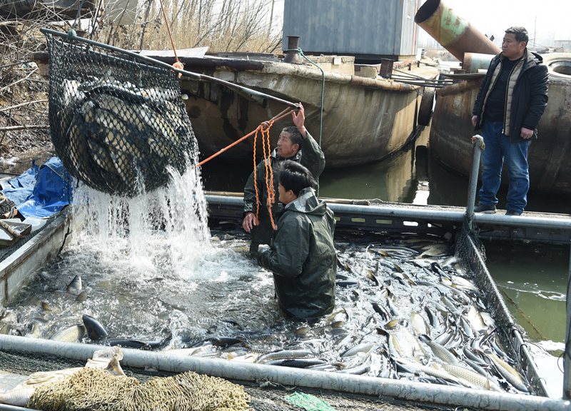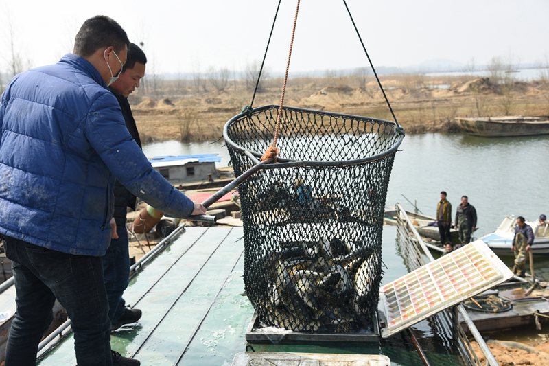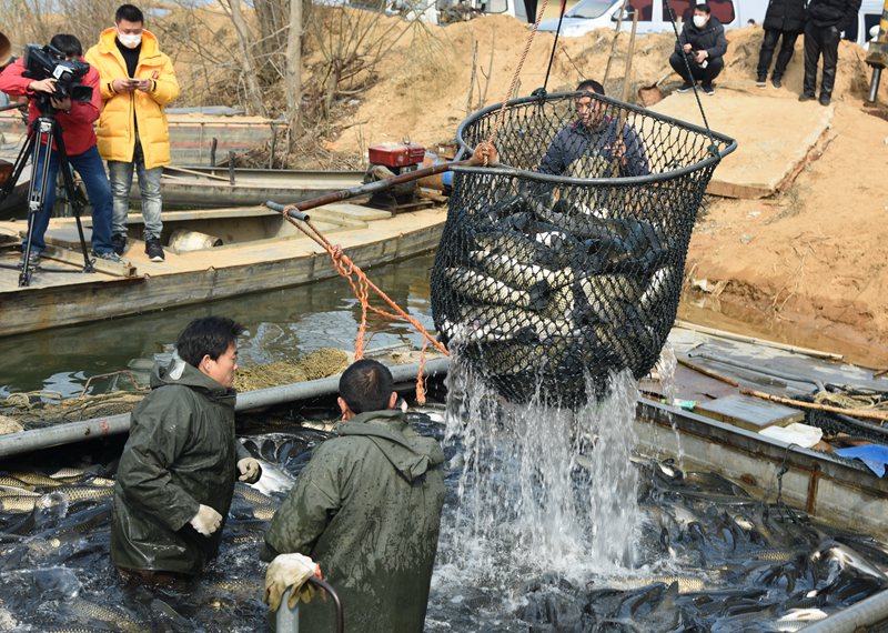 2020年3月3日,江蘇省連云港市東海縣石梁河鎮(zhèn)海陵湖漁民正在起網(wǎng)捕獲草魚。(張正友 攝)
