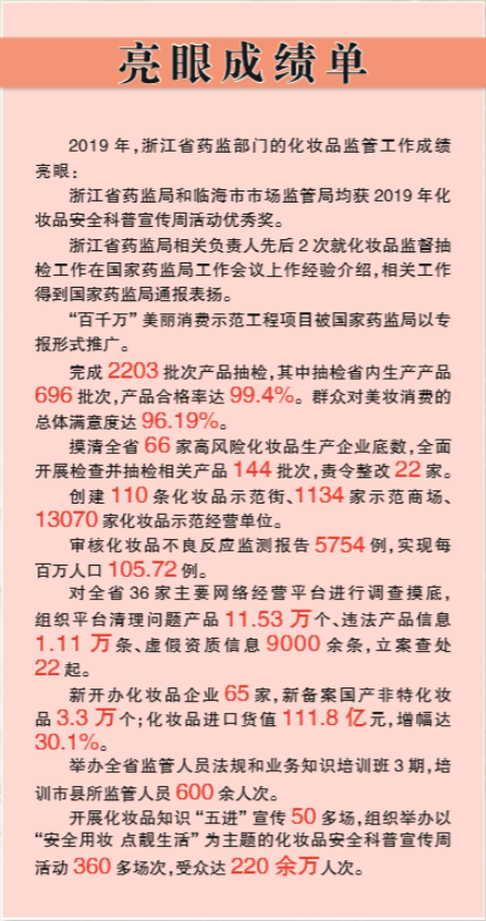 2019年,浙江省藥品監(jiān)管部門嚴(yán)防嚴(yán)控化妝品安全風(fēng)險,創(chuàng)新探索監(jiān)管方式,規(guī)范化妝品行業(yè)發(fā)展;持續(xù)深化改革,優(yōu)化服務(wù),健全監(jiān)管體系,提高監(jiān)管能力水平,化妝品監(jiān)管工作取得新成效。2019年,浙江省化妝品監(jiān)督抽檢合格率達(dá)99.4%,群眾對美妝消費的總體滿意度達(dá)96.19%?!罢惝a(chǎn)美妝”站上全國化妝品產(chǎn)業(yè)發(fā)展第一方陣。