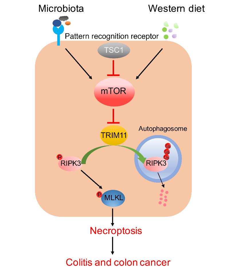 圖示:飲食營養(yǎng)和腸道菌群調(diào)節(jié)腸上皮中TSC1/mTOR和TRIM11/RIPK3信號,影響細(xì)胞壞死和腸炎、腸癌的模式圖。