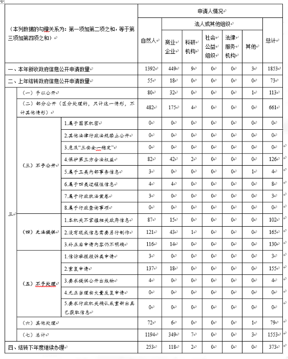 一是申請(qǐng)情況。2019年,新收到有效依申請(qǐng)公開事項(xiàng)1853件,其中,申請(qǐng)人為自然人1392件,占75.1%;申請(qǐng)人為商業(yè)企業(yè)449件,占24.2%;申請(qǐng)人為科研機(jī)構(gòu)9件,占0.5%。從申請(qǐng)渠道來(lái)看,通過(guò)在線平臺(tái)申請(qǐng)1585件,占85.5%;以信函形式申請(qǐng)225件,占12.1%;以傳真形式申請(qǐng)31件,占1.7%;當(dāng)面遞交申請(qǐng)12件,占0.7%。