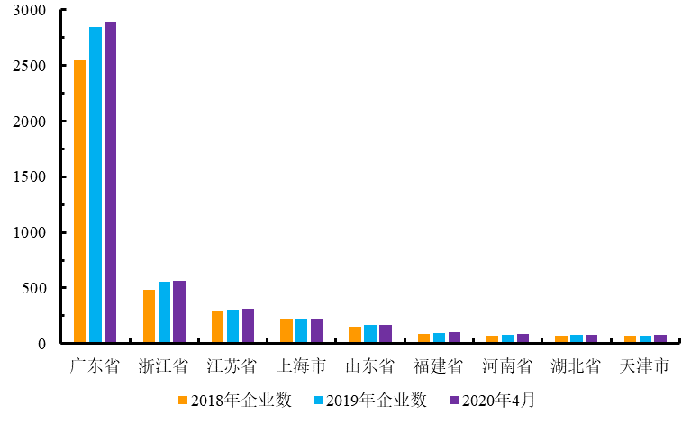 2018年~2020年國內主要省市化妝品獲許可證企業(yè)數(shù)量