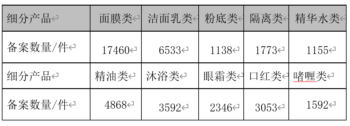 從2019年國內非特化妝品備案產品類型來看,主要集中在面膜類、洗面奶、粉底類、精油類、沐浴類和口紅等。其中當年面膜類申請備案合計17460件,占比38.23%;潔面乳類6533件,14.30%;精油類4868件,占比10.66%;沐浴類3592件,占比7.87%;眼霜類2346件、口紅類3053件。
