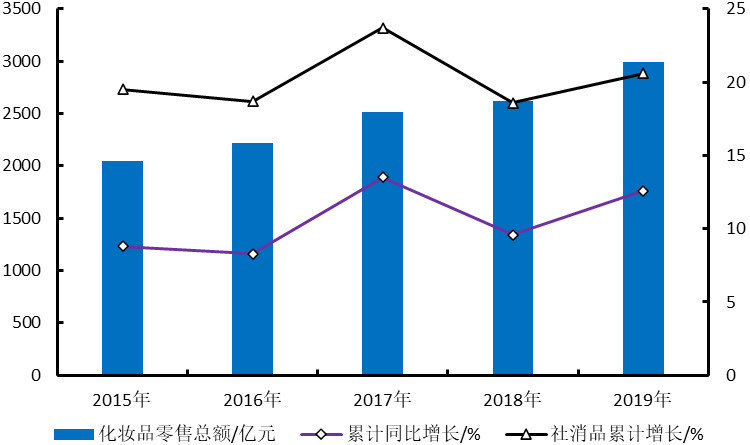 2019年1-12月中國化妝品零售額平均增速為12.5%,高于當年社會消費品零售8.1%的平均增速,其中,3月、5月、6月、8月、9月、11月和12月化妝品零售同比增長均保持兩位數(shù),6月高達22.5%,高于社會消費品9.8%近13個百分點。