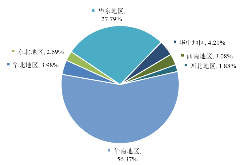 按照地區(qū)分布來看,2019年華北地區(qū)獲許化妝品生產企業(yè)合計207家,占比3.98%;東北地區(qū)合計140家,占比2.69%;華東地區(qū)合計1446家,占比27.79%;華中地區(qū)合計219家,占比4.21%;西南地區(qū)合計160家,占比3.08%;西北地區(qū)合計98家,占比1.88%;華南地區(qū)合計2933家,占比56.37%。