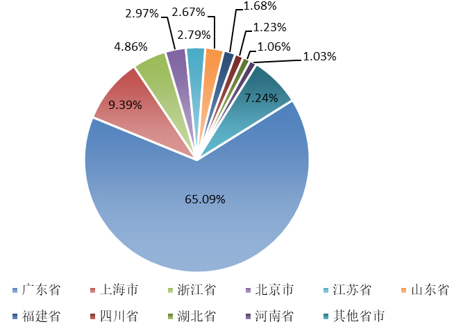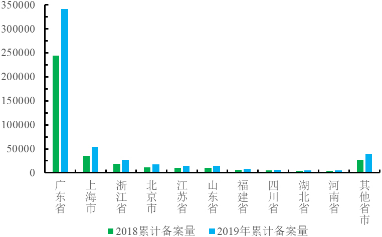 2018年國內非特化妝品累計備案數(shù)量達到375152件,2019年全年新增備案數(shù)量接近16萬件,截止到2019年12月31日,全部非特化妝品備案數(shù)量累計達到533425件,較2018年同比增長42.19%。其中,廣東省累計備案數(shù)341624件,占比65.09%;上海市累計備案數(shù)量53846件,占比9.39%;排名三至五名的省市分別是浙江省、北京市和江蘇省,2019年非特化妝品累計備案數(shù)分別為26752件、17157件和14643件,排名前五省市合計備案數(shù)達到454022件,占比85.10%。
