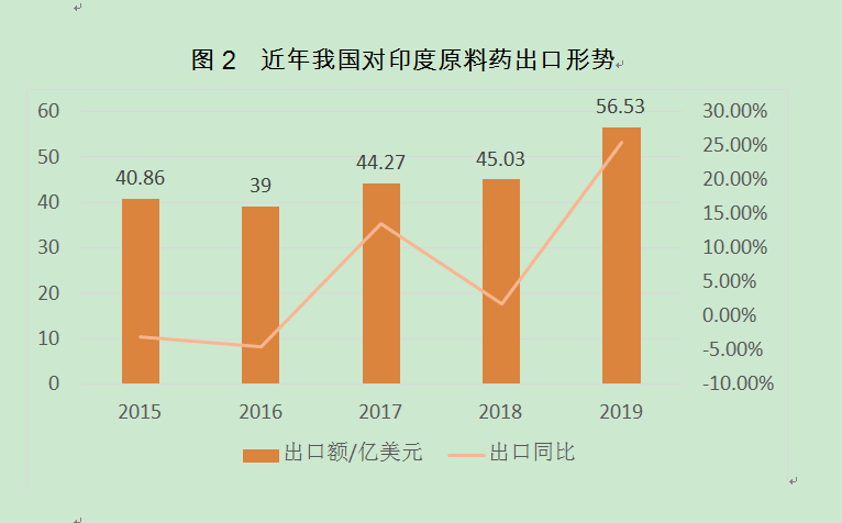 圖2 近年我國(guó)對(duì)印度原料藥出口形勢(shì)