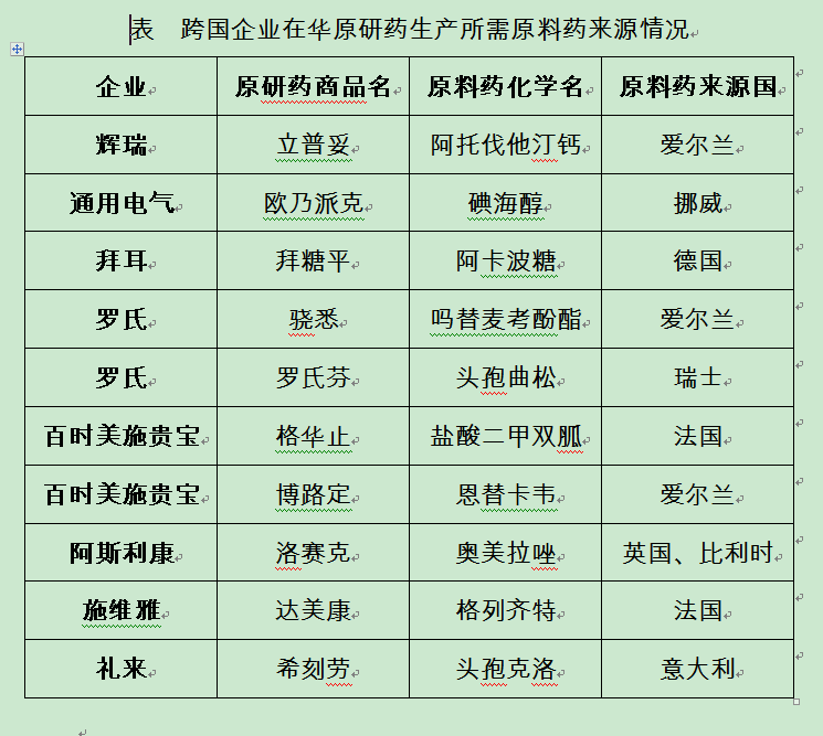 表 跨國(guó)企業(yè)在華原研藥生產(chǎn)所需原料藥來(lái)源情況