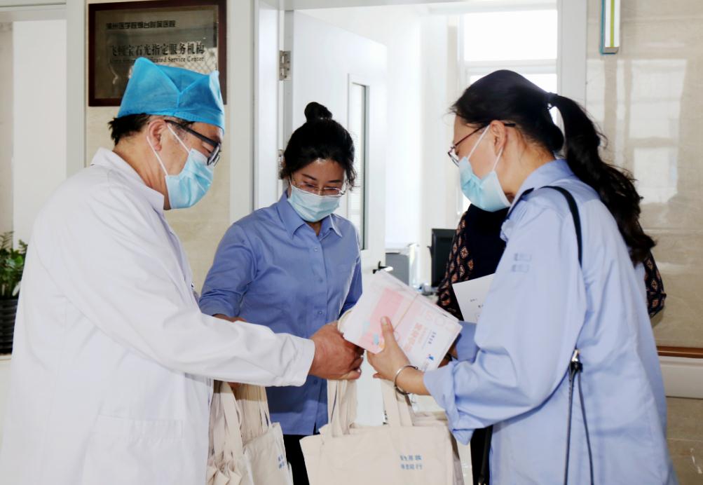 煙臺(tái)市牟平區(qū)市場(chǎng)監(jiān)管局工作人員前往當(dāng)?shù)夭涣挤磻?yīng)哨點(diǎn)醫(yī)院發(fā)放宣傳手冊(cè),并與該院皮膚科大夫就化妝品不良反應(yīng)相關(guān)工作進(jìn)行溝通。(山東省藥監(jiān)局供圖)