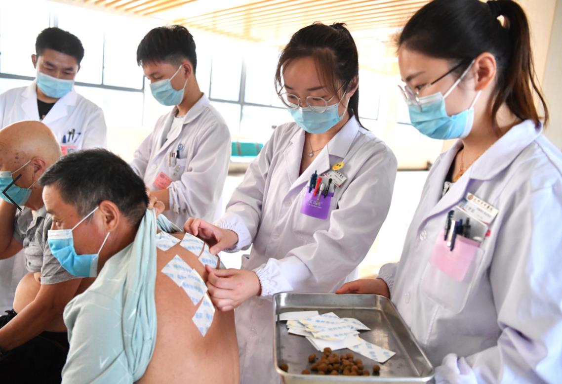 6月21日,在安徽省亳州市中醫(yī)院,醫(yī)護(hù)人員為市民貼“三伏貼”。(劉勤利 攝)