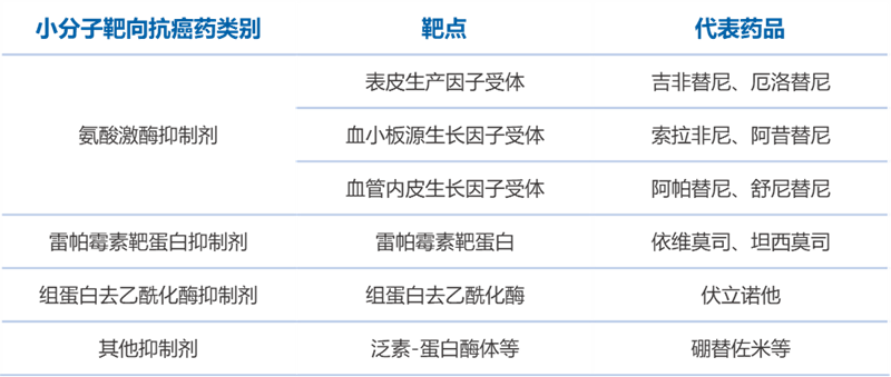 依據(jù)靶點不同,小分子靶向抗腫瘤藥物可分為酪氨酸激酶抑制劑、組蛋白去乙?;敢种苿?、雷帕霉素靶蛋白抑制劑等類型。其中,酪氨酸激酶抑制劑類藥物是小分子靶向抗腫瘤藥物的主要組成部分。